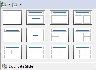 Improved Slide Layout Handling in Impress This reduces the number of slide layout varieties making the layout selection much clearer. In addition, you can now also assign layouts to slides and create new slides with a specific layout using the toolbar. One new toolbar element is used to add a new slide (or duplicate the currently selected slide).
